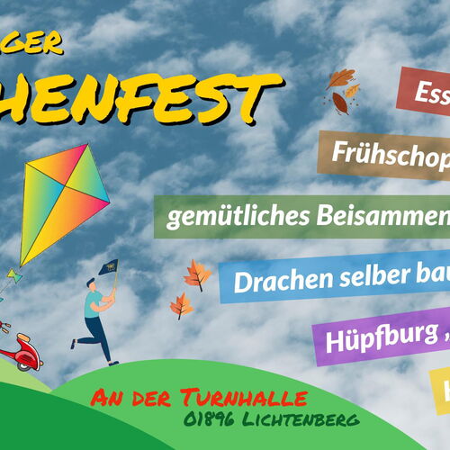 Nach einem großen Erfolg im letzten Jahr freuen wir uns wieder alle Lichtenberger und Kleindittmannsdorfer bereits zum 2. Drachenfest am 31. Oktober begrüßen zu dürfen. Der Frühschoppen beginnt ab 10.00 Uhr diesmal vor der Turnhalle in Lichtenberg. Bei hoffentlich guten Windbedingen kann jeder der möchte seinen Drachen (egal ob mitgebracht oder vor Ort gekauft und bemalt) steigen lassen. Wer es lieber etwas gemütlicher mag, kann den Tag bei uns gern bei einem kühlen Getränk und reichlich zu Essen verbringen. Für alle die am Nachmittag oder Abend noch zur Halloweenparty gehen, besteht die Möglichkeit sich vor Ort schminken zu lassen. Auch eine Hüpfburg haben wir passend zum Drachenfest organisiert. Bei kühlem Wetter steht ein beheiztes Zelt zur Verfügung. Bitte tragt euch den Termin fest ein.